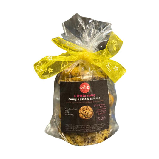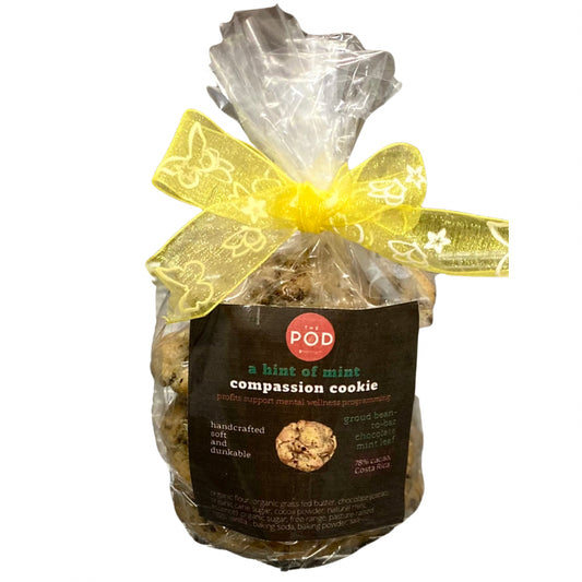 The CompassionCookie makes impact locally and globally. A little crispy on the outside and pure mush within. Not only does your purchase support mental health programming locally, but our purchase of chocolate made by cacao farmers/producers who empower social, economic, and environmental growth within their cacao-growing countries. Cookies are baked on-site at ThePod by CocoaCompassion.
